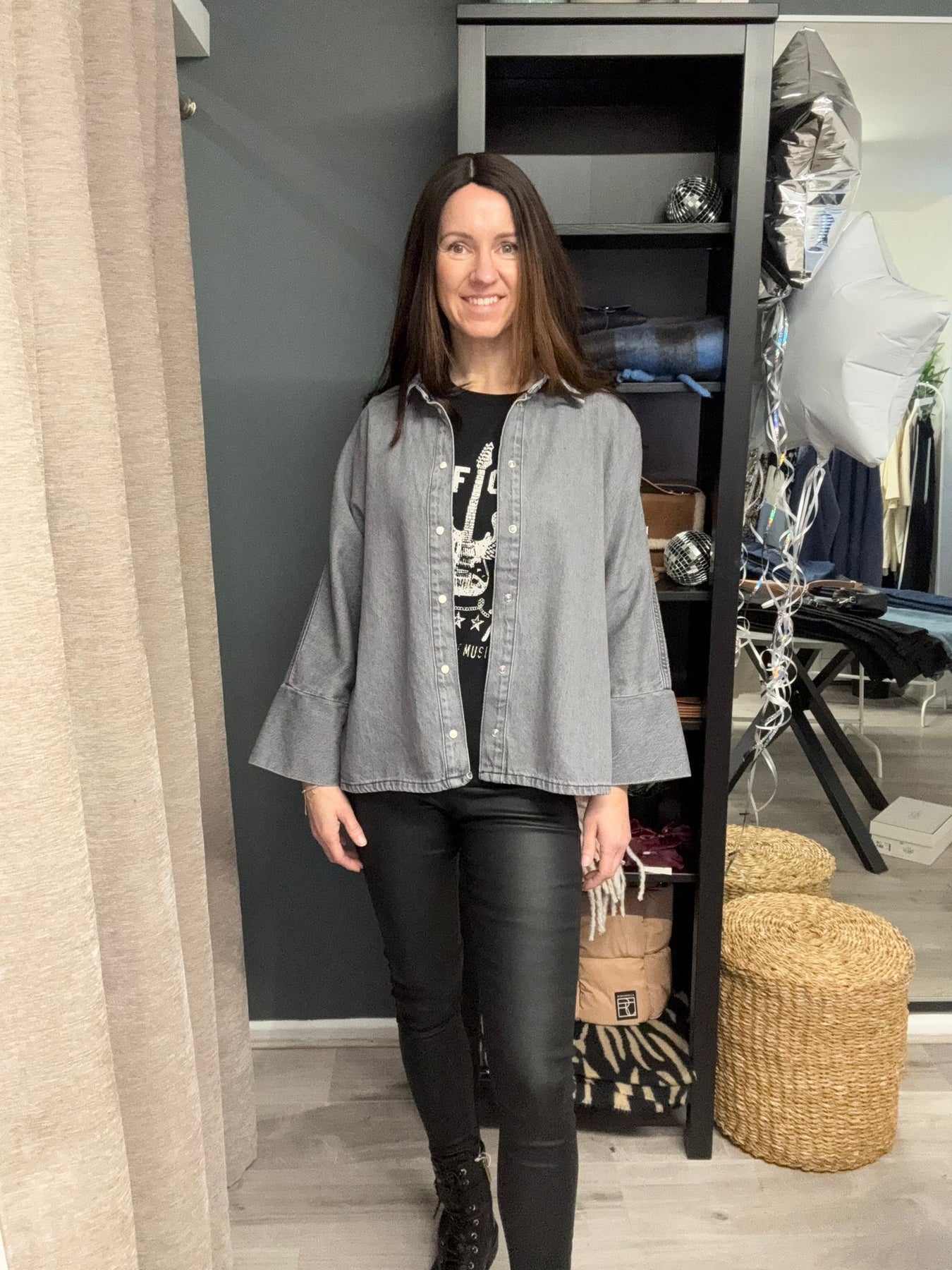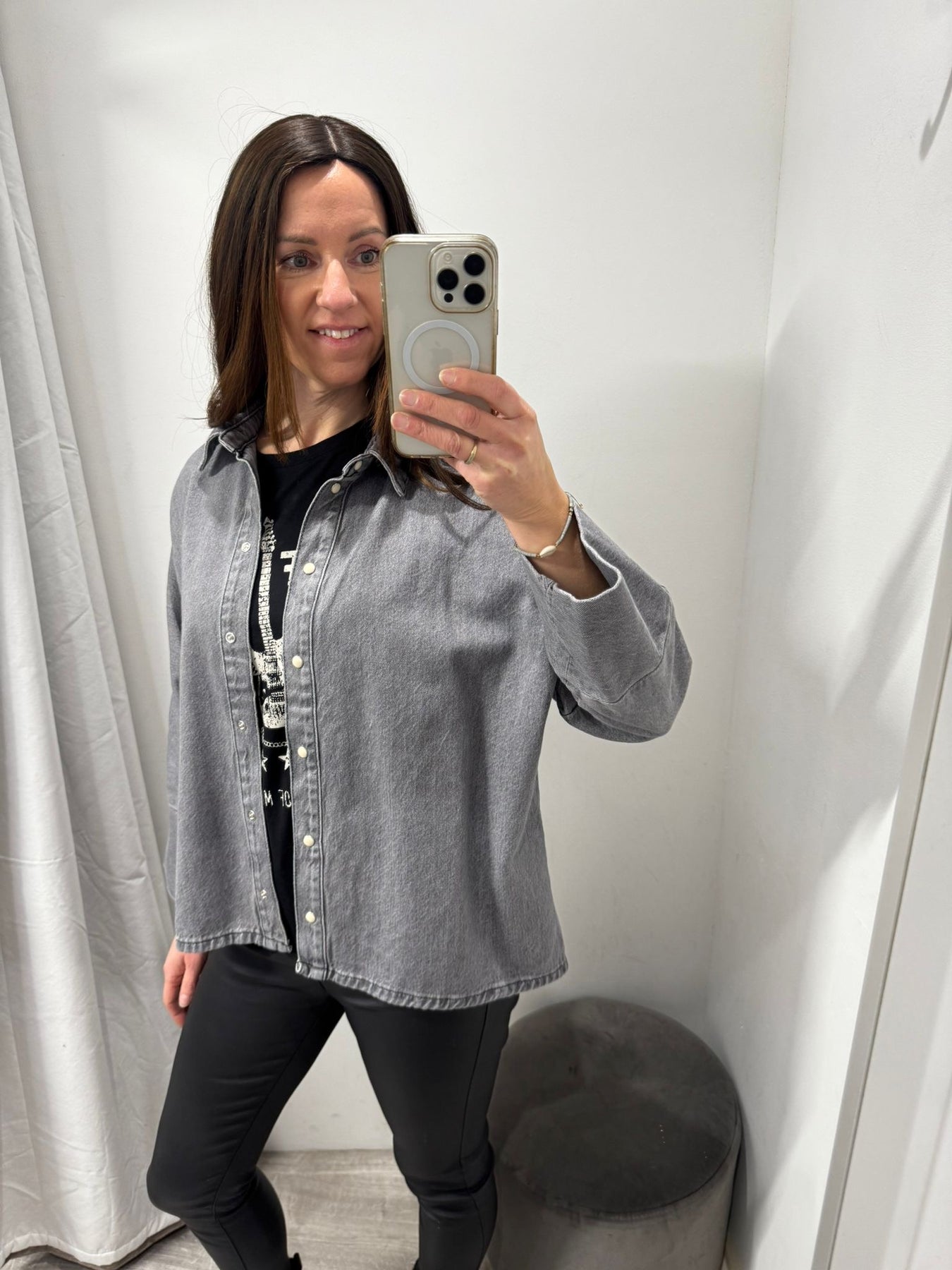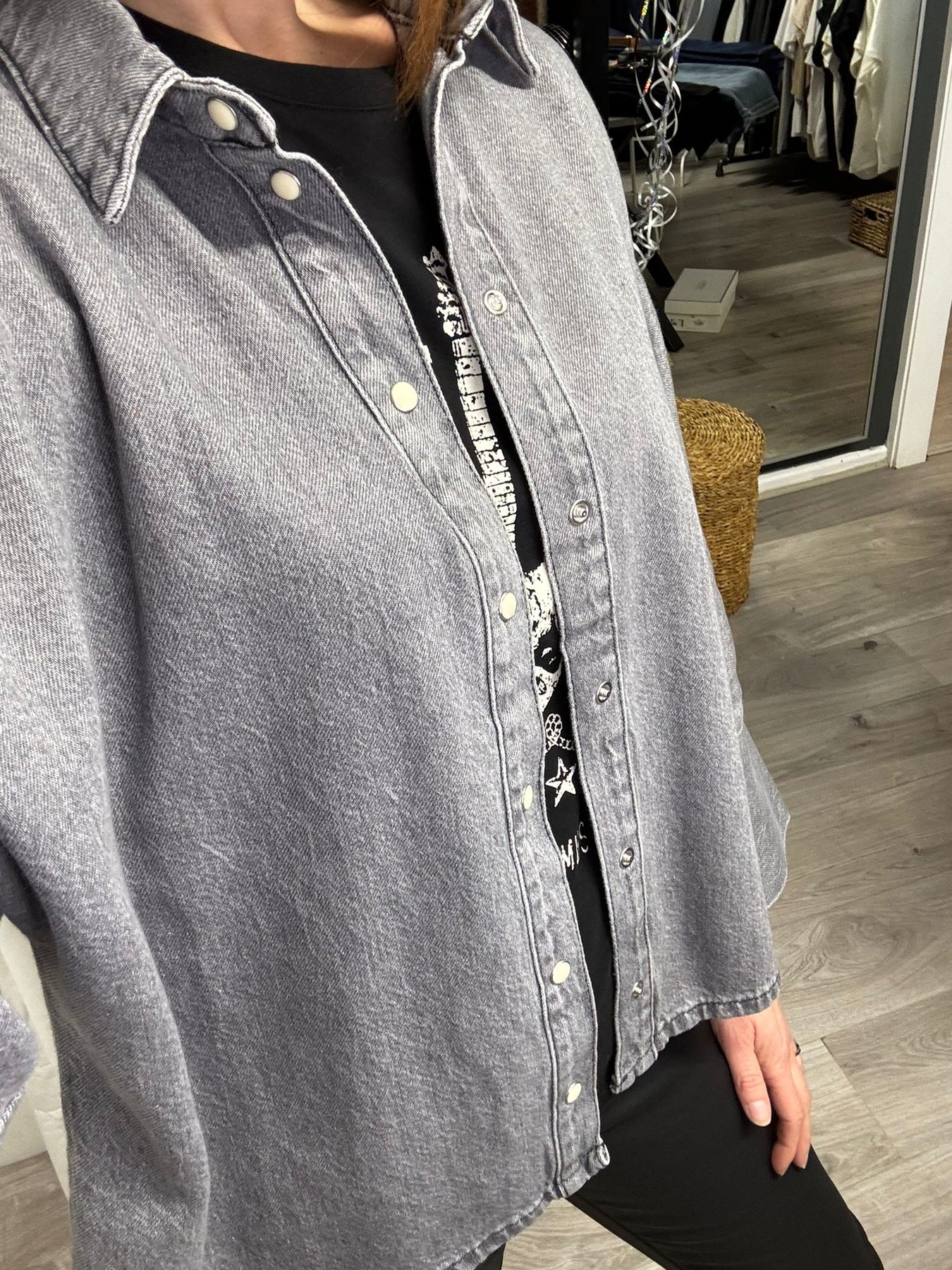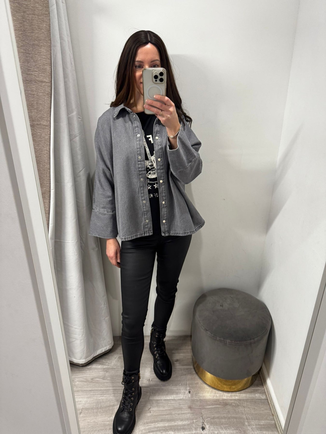 Crafted in a soft grey denim, it features a classic collar, wide 3/4 sleeves, and a boxy, easy-wearing fit that layers beautifully. The pressed stud front with its subtle pearlescent finish gives it that premium touch while keeping the look modern and versatile.