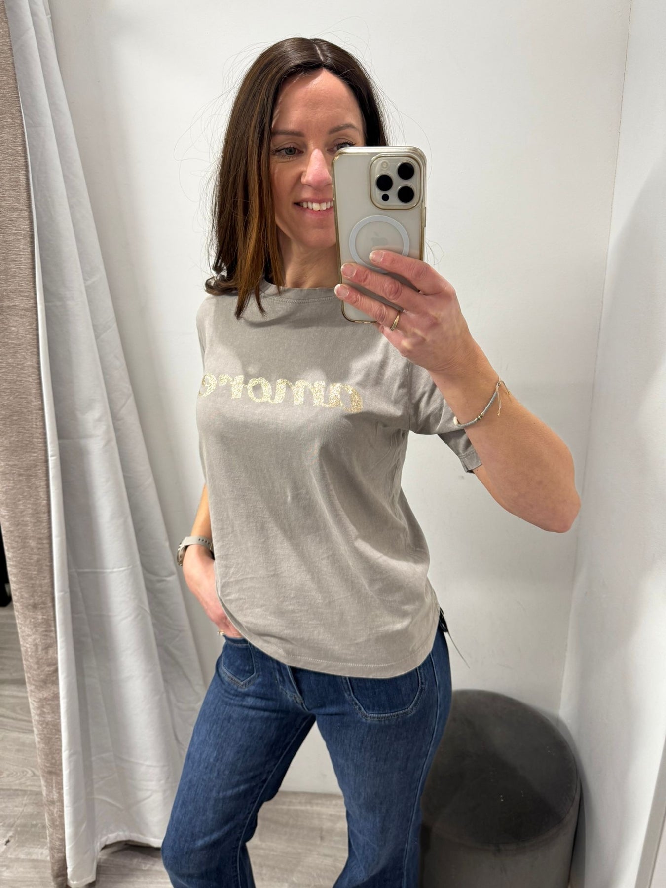 A best-selling favourite at Indie’s, now in a fresh soft washed grey colourway. The Solko T-Shirt features a bold “Amore” print in gold to the front.