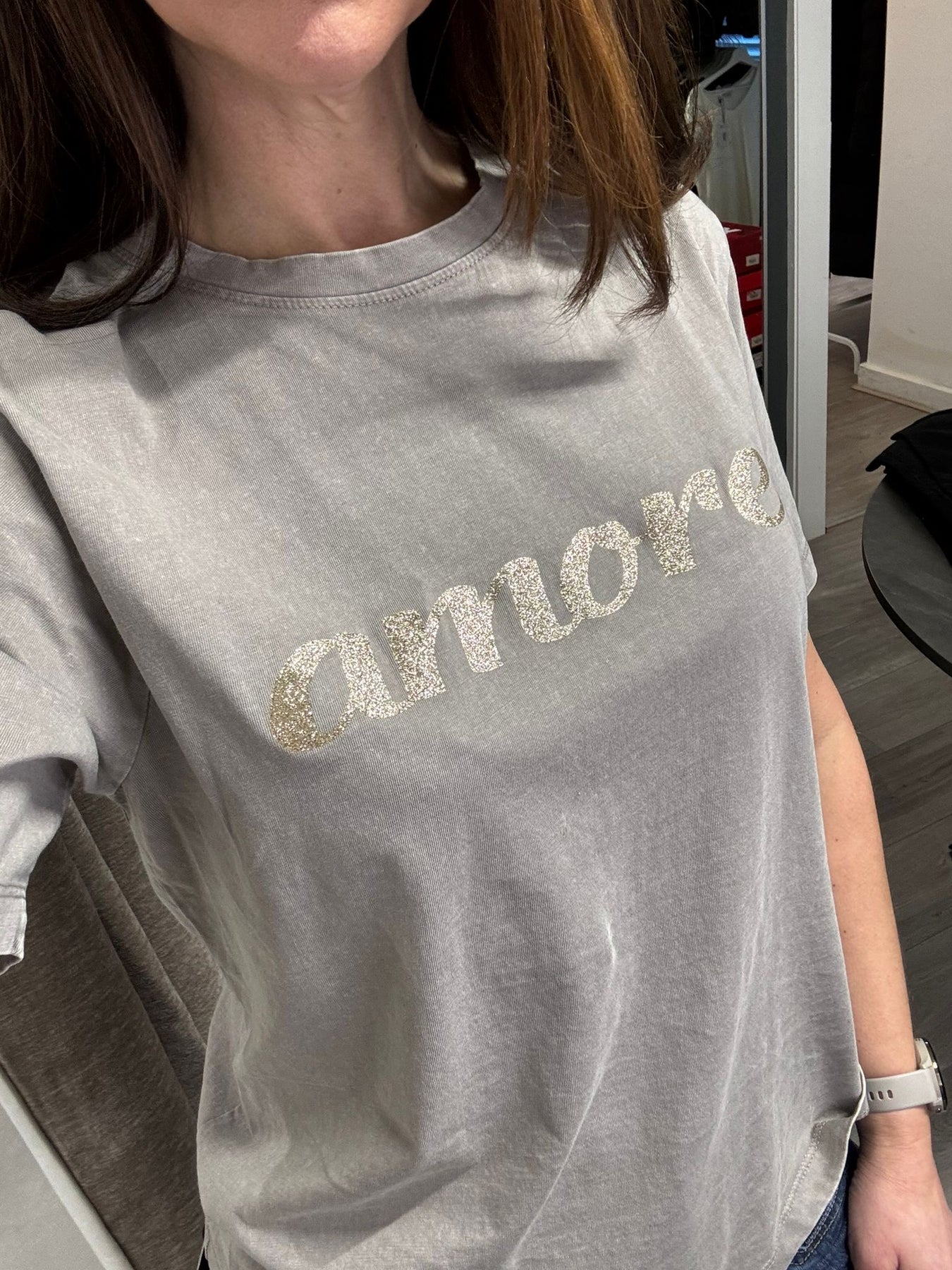 • Bold “Amore” print in gold