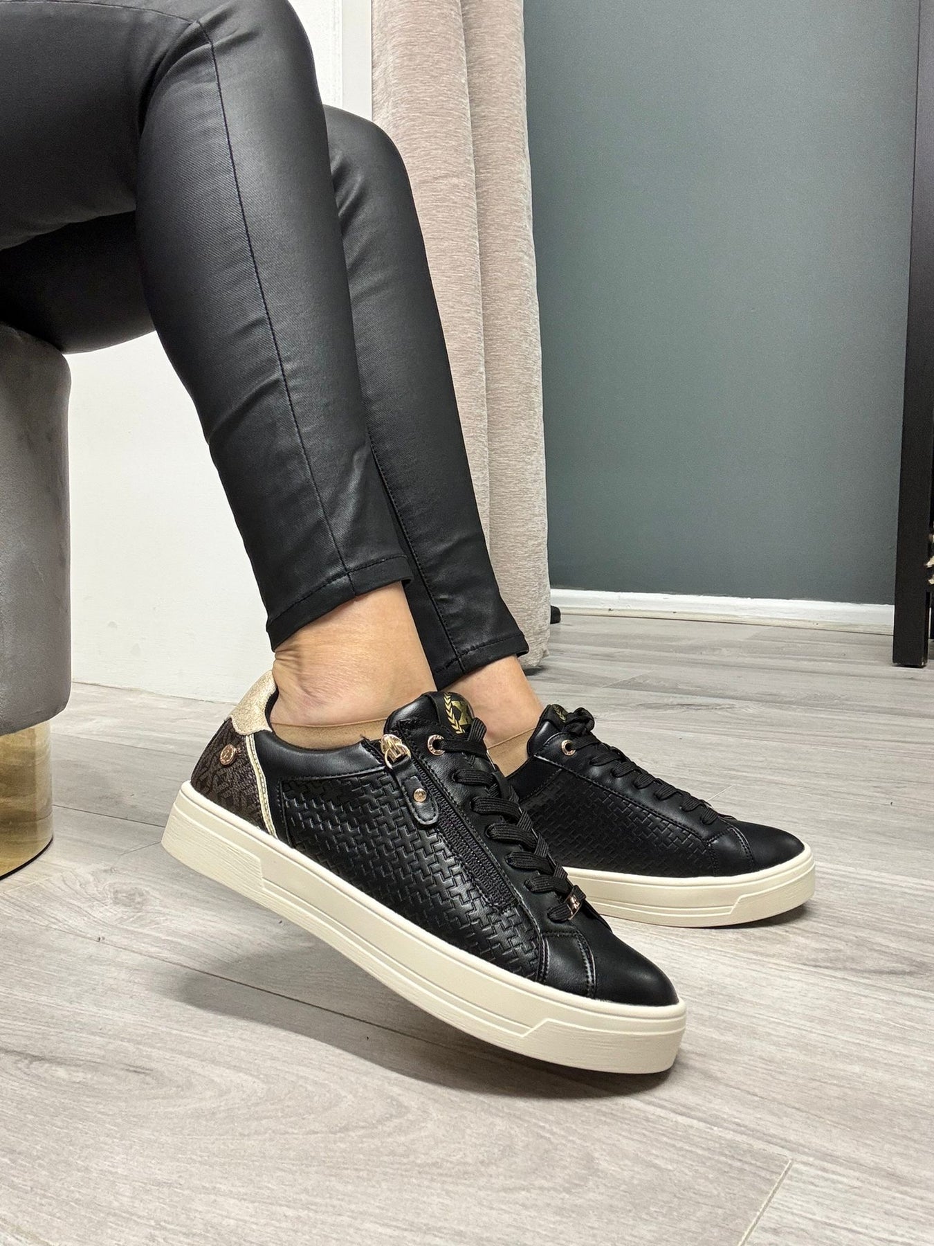 A best selling style at Indie's, these premium trainers from Spanish brand, Xti, are the perfect blend of style, comfort, and everyday versatility. Handcrafted in Spain, they feature an embossed side design, brown and black print to the back with gold hardware. They have a lace-and-zip fastening for easy on-and-off wear.