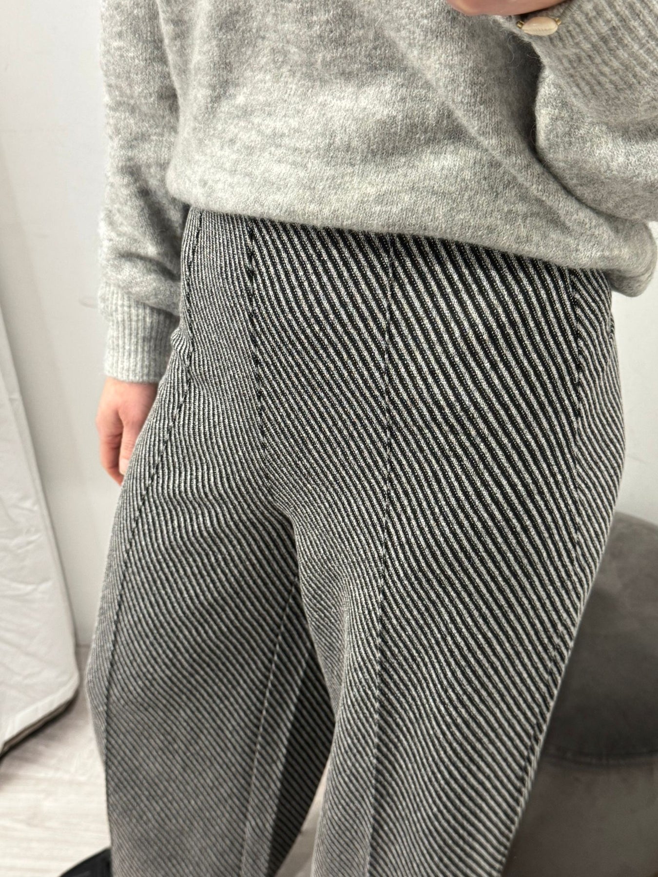 Crafted in a striking black and grey diagonal stripe, these trousers feature a wide-leg silhouette and high-waisted fit that flatter beautifully. The elasticated waist paired with a side zip fastening ensures comfort without compromising on shape, while the piped front detailing adds a sleek, tailored finish.