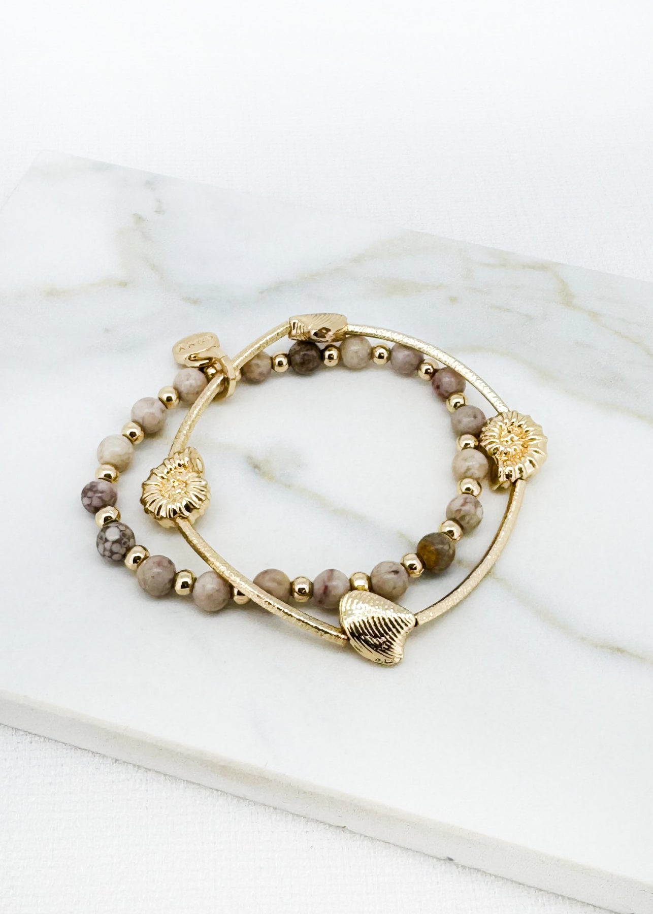 Add a hint of ocean-inspired style to your look with this double-layer stretch bracelet. Featuring textured stone beads, gold-tone accents and a charming starfish detail, it’s an easy slip-on piece with effortless appeal.