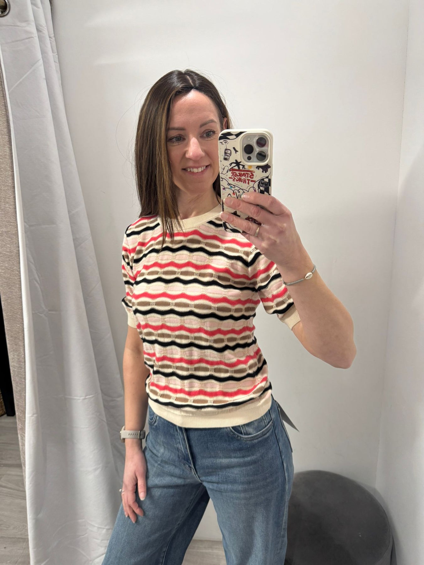 The Aitana Pullover from premium new brand Garcia is a stunning statement knit for spring and summer. With short sleeves, a round neckline, and a regular fit, it’s effortlessly flattering and comfortable. Stripes in cream, coral, pale pink, and black are elevated with a subtle metallic gold yarn woven through the fabric, giving this pullover a luxe, timeless finish.