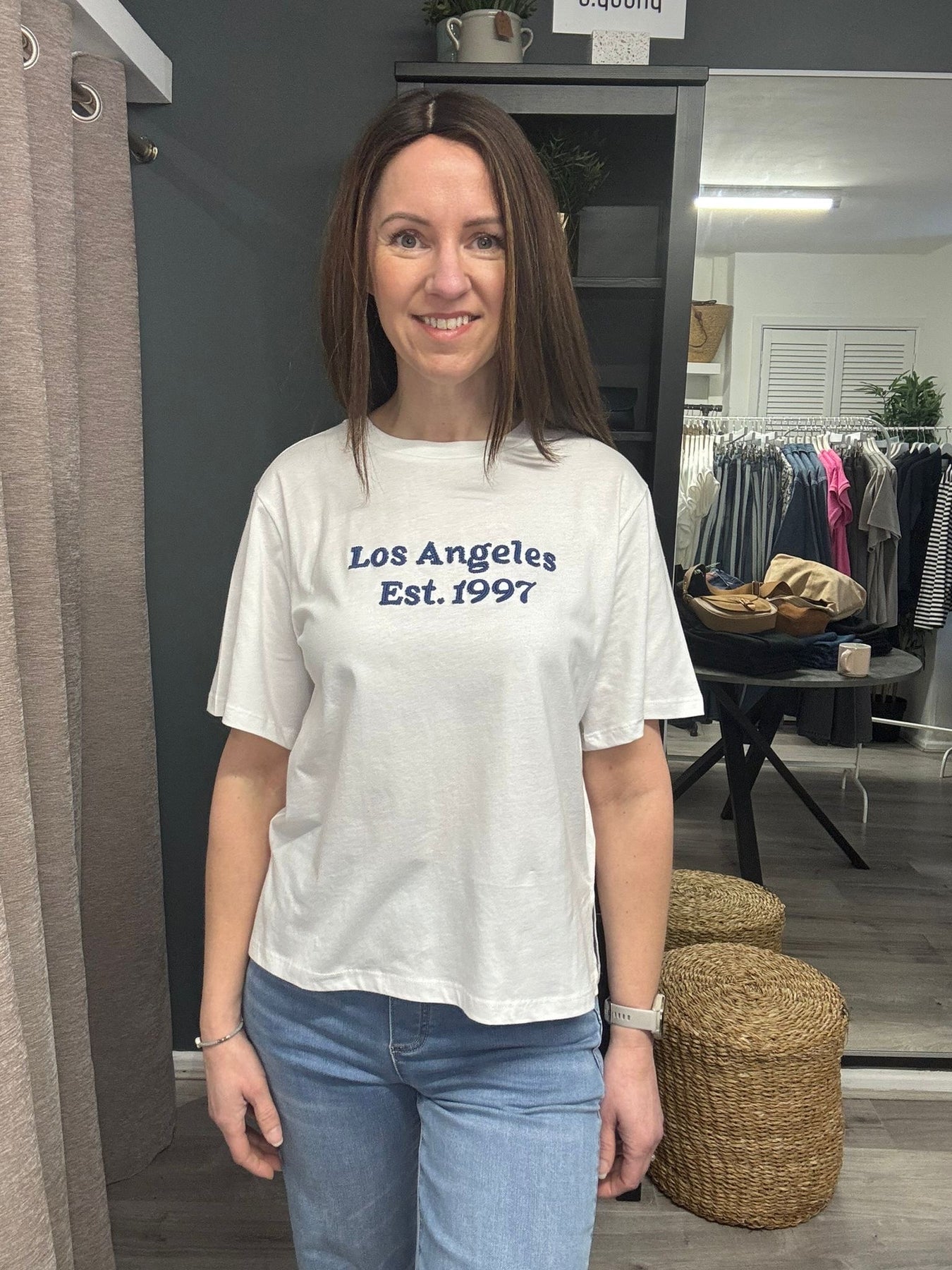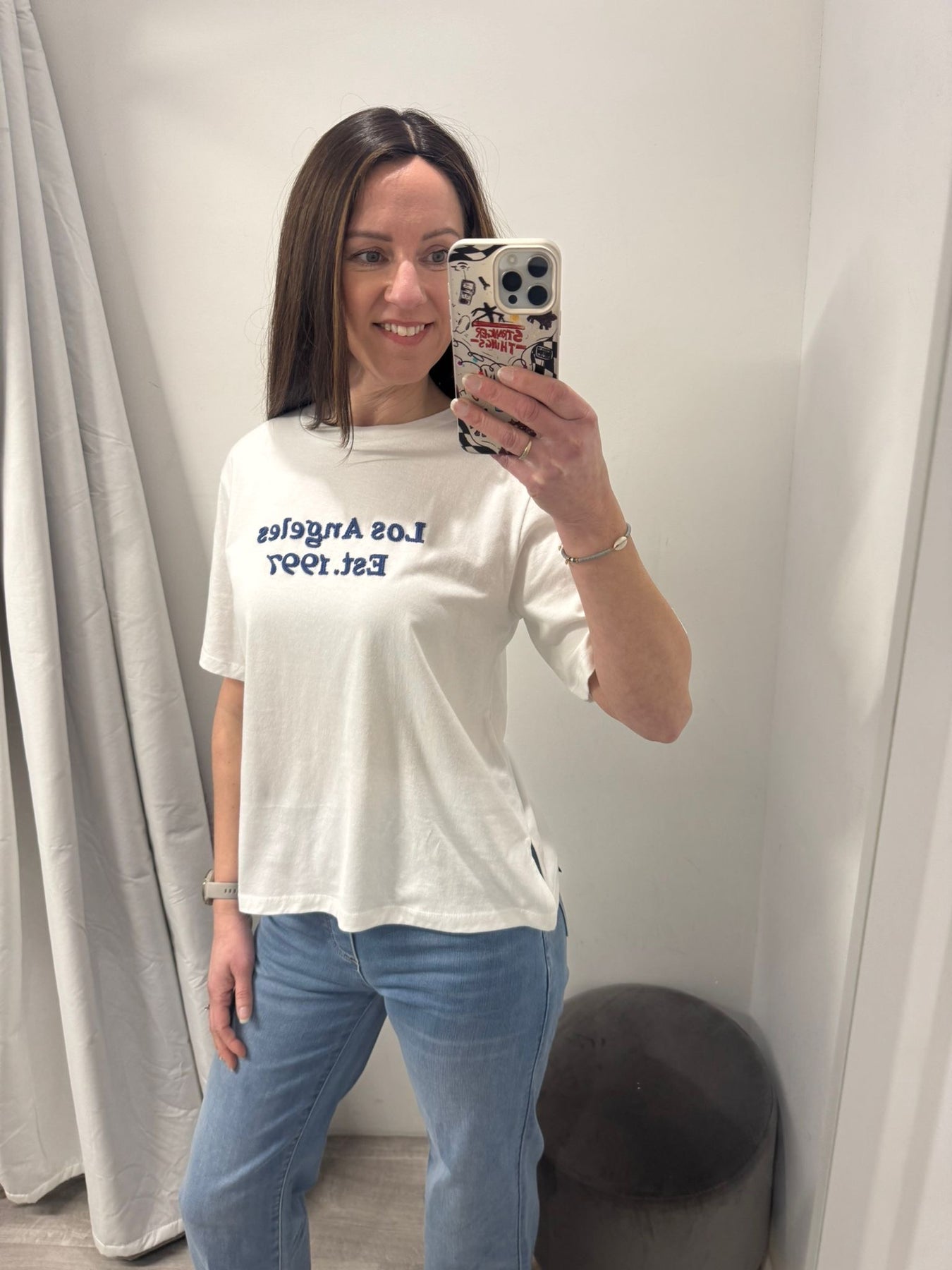 The standout detail is the ‘Los Angeles Est. 1997’ graphic in navy embroidered lettering on the front, giving a contemporary, textured finish. Thoughtful design touches, including side slits, elevate the look and add subtle sophistication to a wardrobe staple.