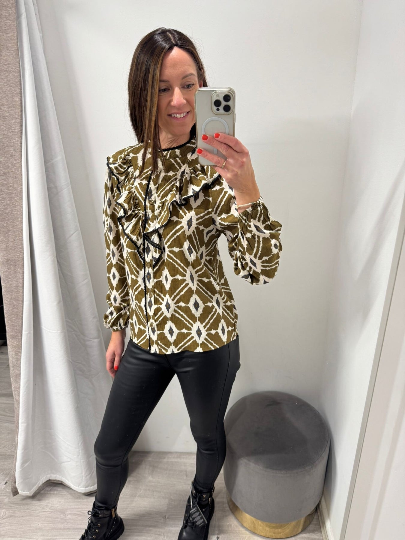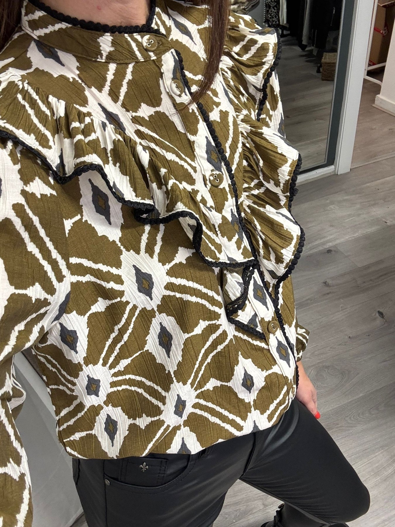 Step into the new season in style with the Inaba shirt from BYoung. This stunning shirt features a round neck, button-front fastening, and statement frill detail to the front for a sophisticated, effortless look. Long sleeves with button fastening cuffs and a regular fit make it comfortable and versatile, while the earthy green print with cream and charcoal accents adds a contemporary, autumnal touch.