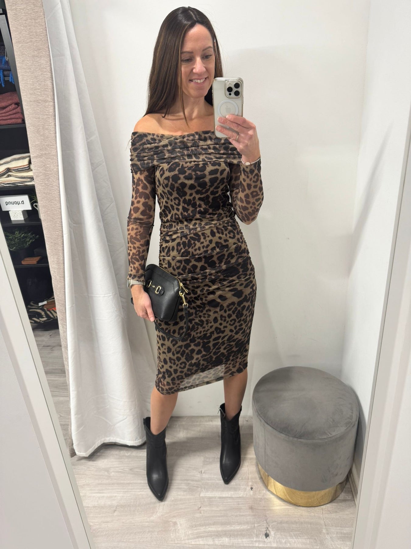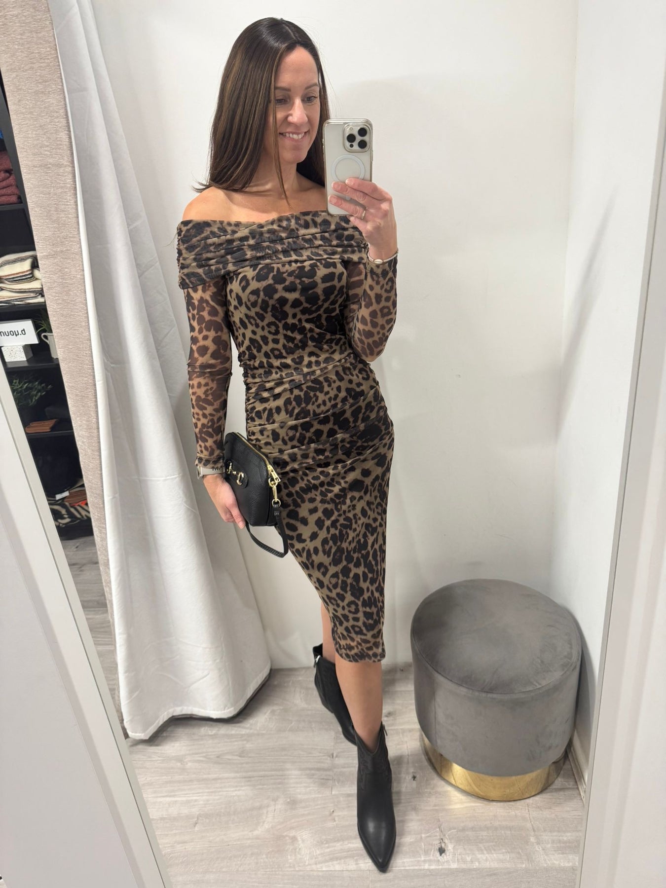 Turn heads this season in the Parda Dress from premium brand ICHI. This leopard print mesh midi dress is designed to flatter every curve with its fitted silhouette, ruched sides, and stretch fabric. Featuring an off-the-shoulder panel, a lined body, and sheer long sleeves, it’s the perfect mix of elegance and edge.