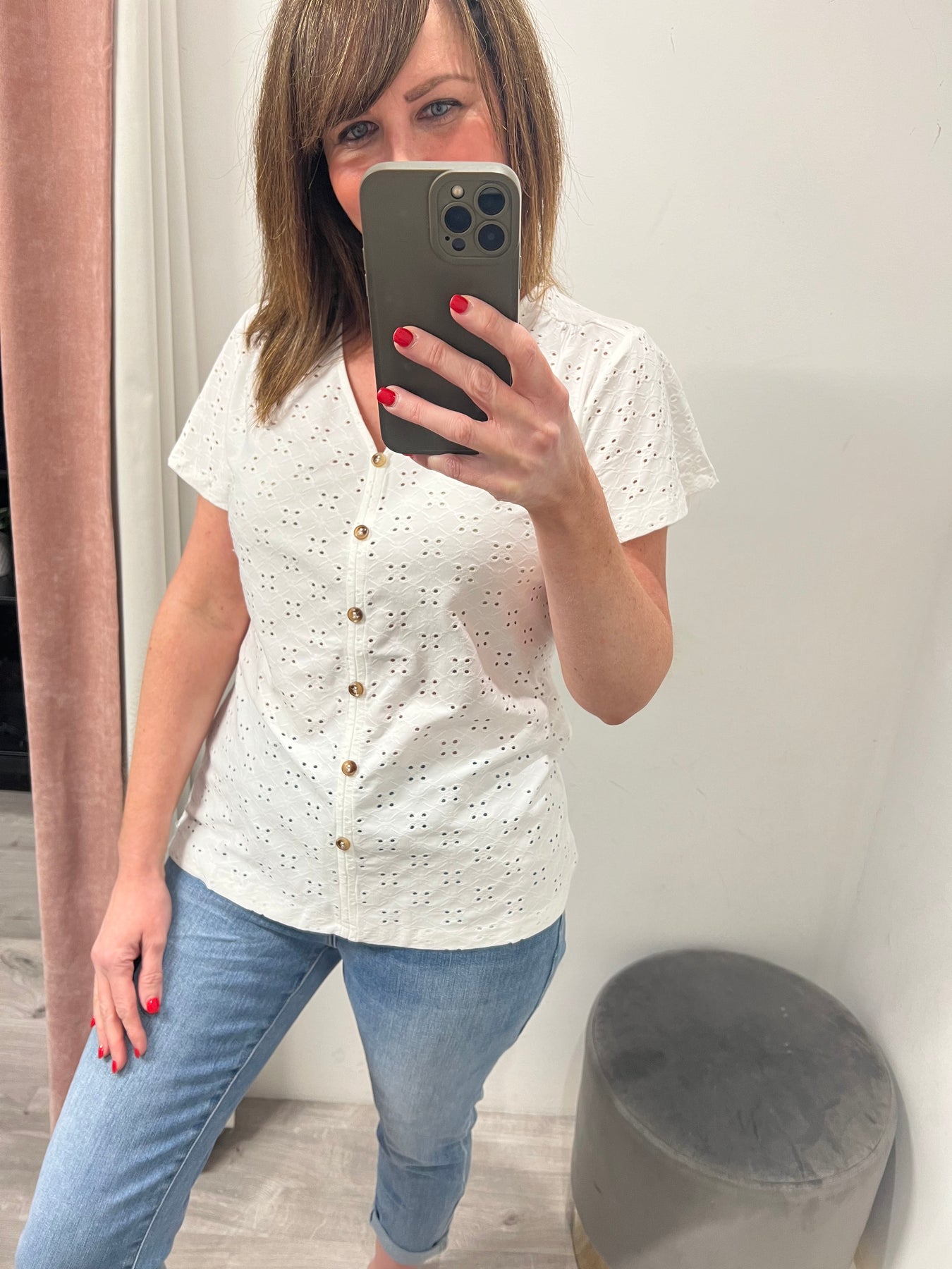 A new favourite at Indie's, the Isla top is so pretty and perfect for 'jeans and a nice top' styling. It's super soft fabric with beautiful crochet detailing throughout. An easy-wearing style featuring a v neck, faux buttons to the front, and a short sleeve.