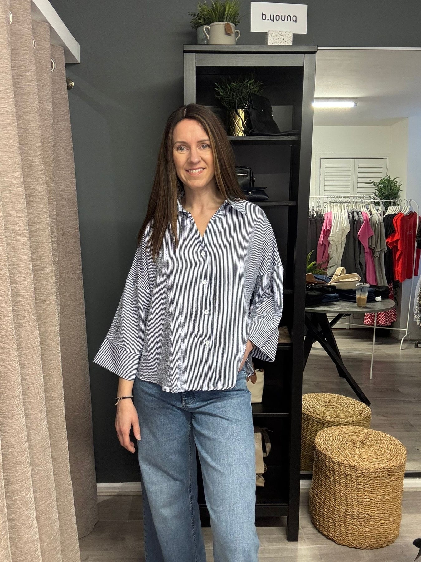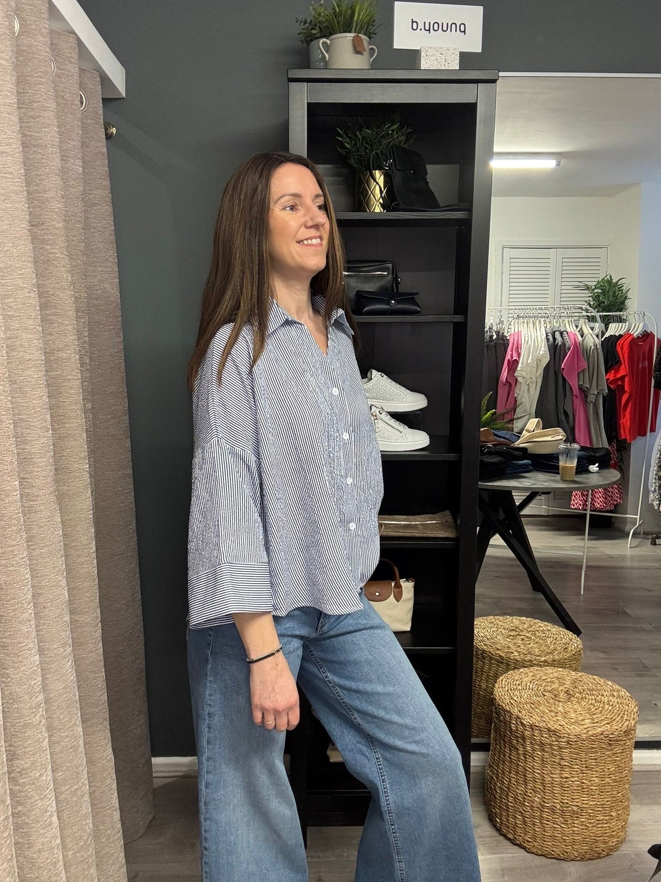 Meet the Lucia Shirt in a timeless navy and white stripe - an effortless, everyday staple.