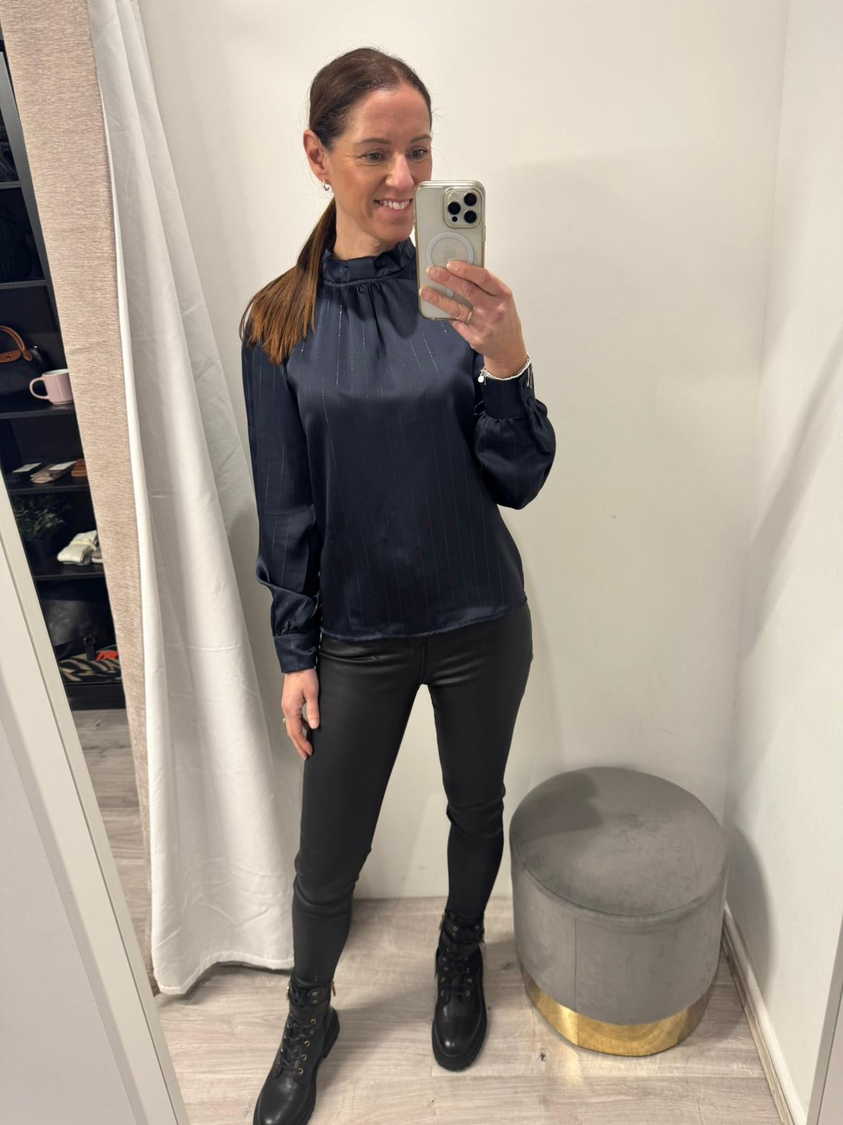 The Dorota Blouse from premium brand Pulz is a stunning statement piece in deep navy satin. Designed with a high neck and delicate frill detail, it features puff shoulders and statement sleeves with elegant cuffs, creating a flattering, on-trend silhouette.