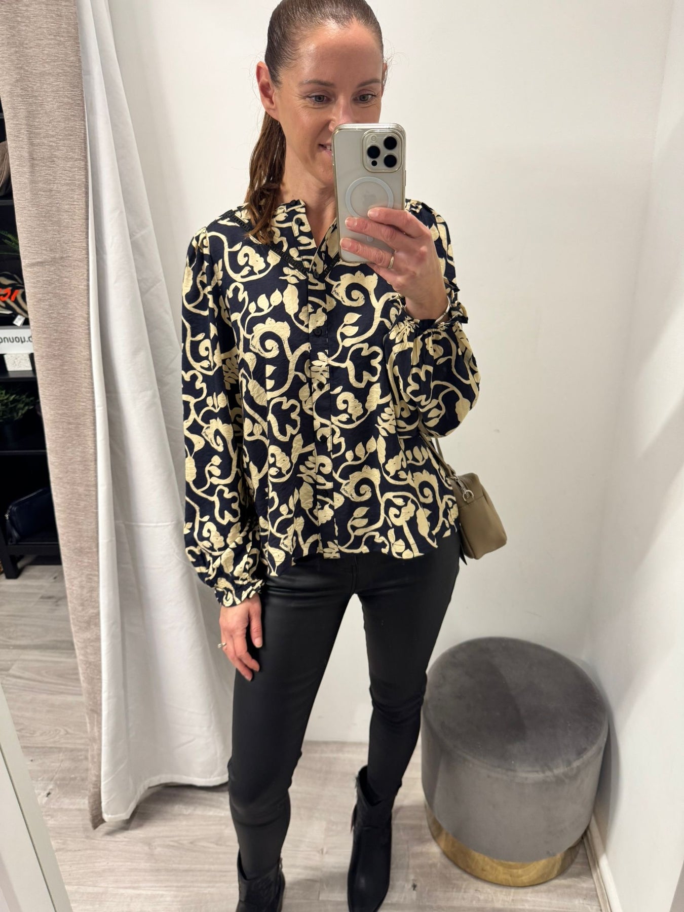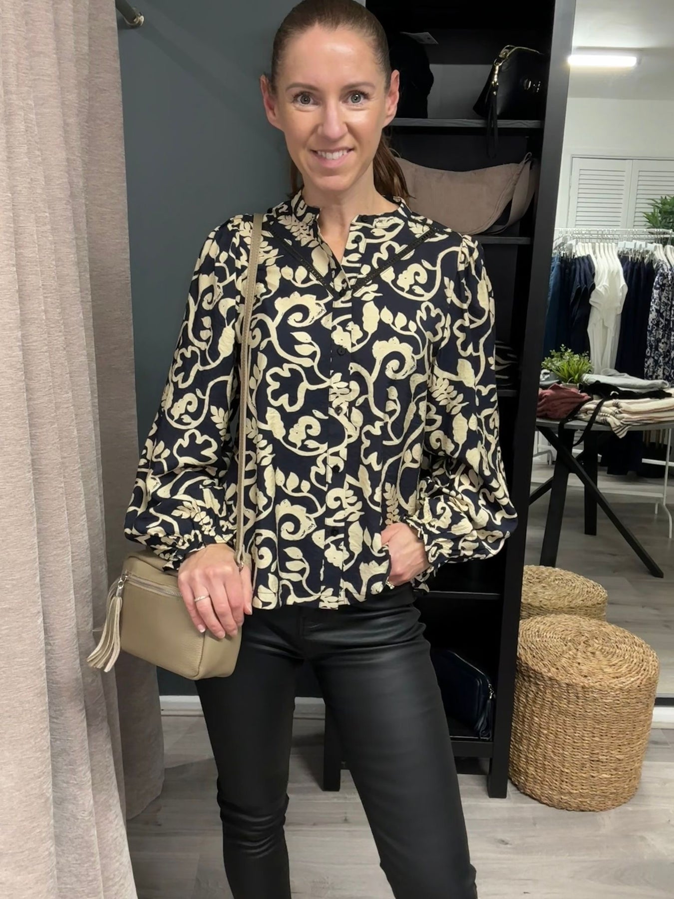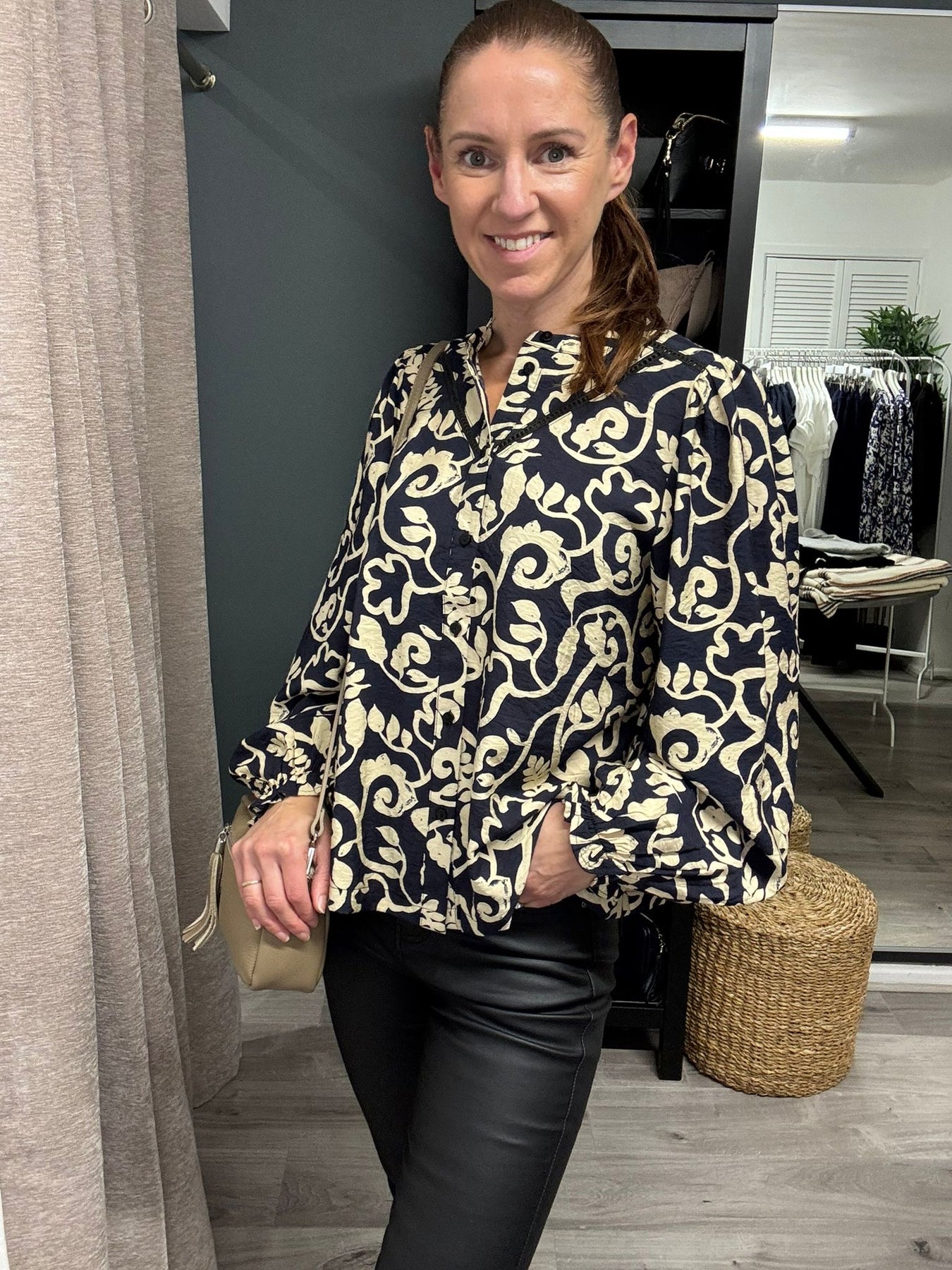 Make a statement this season with the Lamia Shirt from premium brand ICHI. Featuring a bold navy and beige botanical print, this shirt is all about effortless style with a touch of drama. Statement puff shoulders and balloon sleeves with frilled cuffs give it a feminine, on-trend silhouette, while a round neckline and black trim down the front add sophistication. Finished with a button fastening, it’s a must-have for your wardrobe.