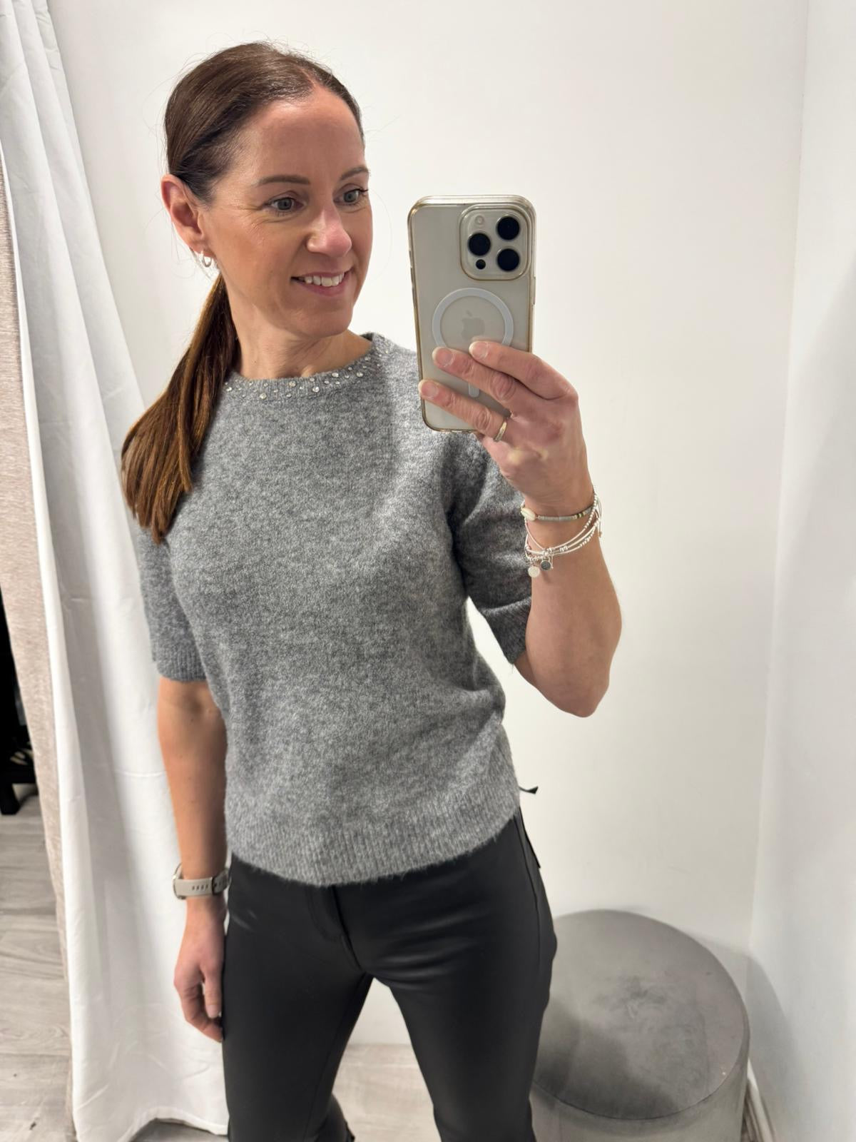 The Omea Rhinestone Jumper is a gorgeous, lightweight knit designed to add a touch of glam to your wardrobe. Cut in a regular fit with short sleeves and a classic round neck, it features diamantés around the neckline for a timeless, elegant finish.